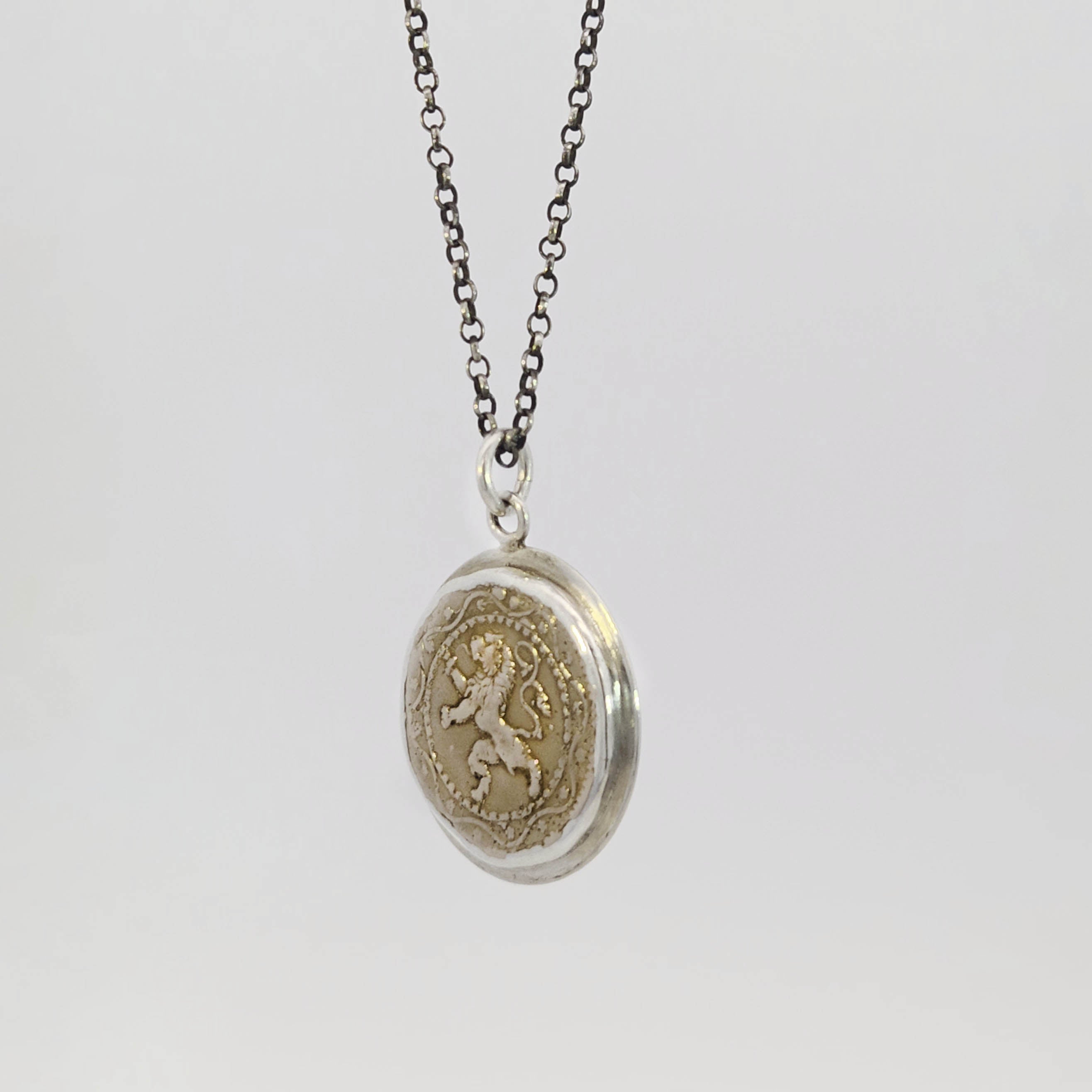 Made from an impression of a Belgian coin I kept from my first trip to Belgium, (no monetary value). A small keepsake of history in a hand-fabricated sterling frame. One of a kind, made by hand at my bench. Includes an adjustable 20" antiqued sterling silver rollo chain, wearable at 16", 18", or 20".