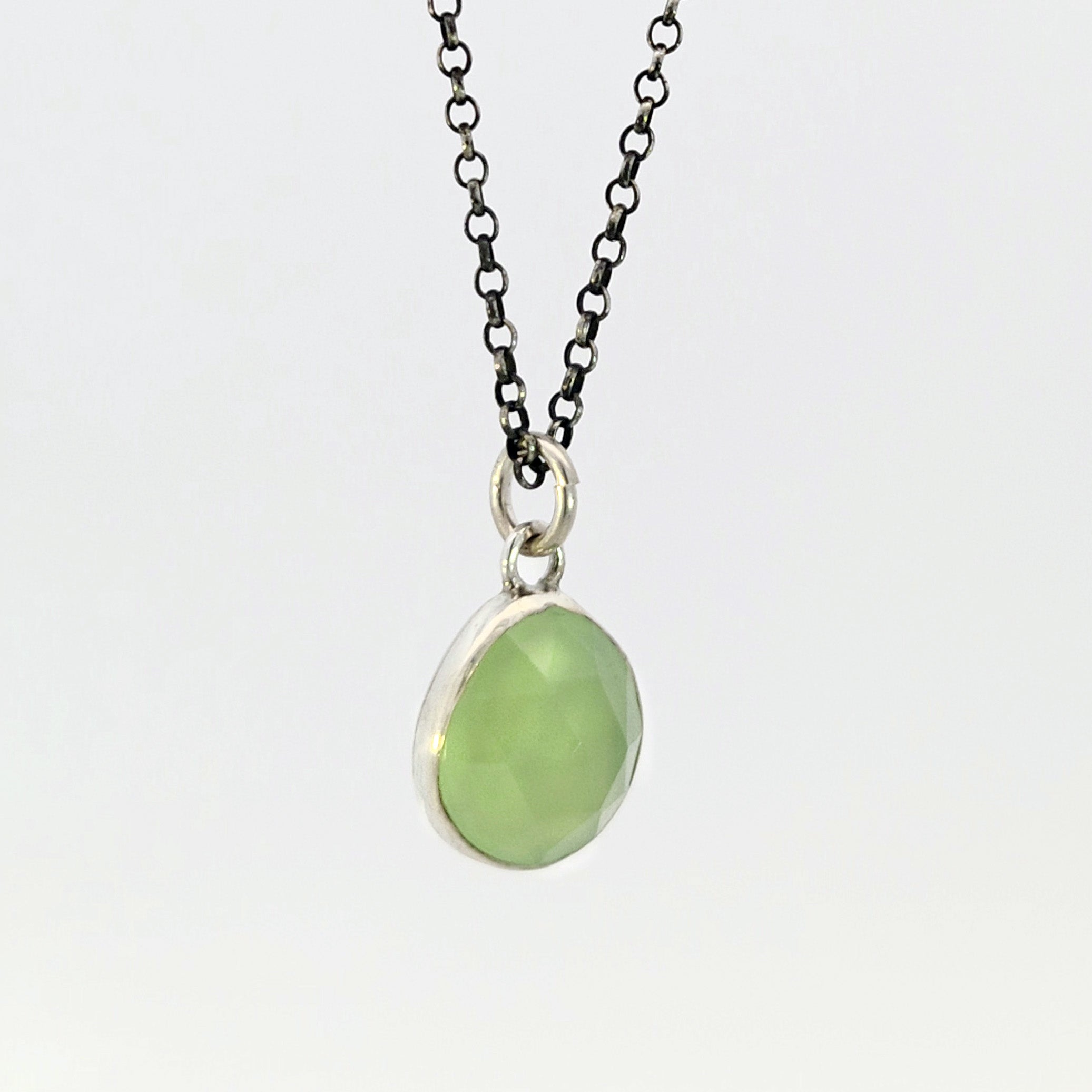 Fresh, minty chalcedony set in a hand-fabricated sterling bezel. Clean lines let the color speak. Three available, each pendant is one of a kind, individually made at my bench. Size: Overall pendant 15 × 11 mm.