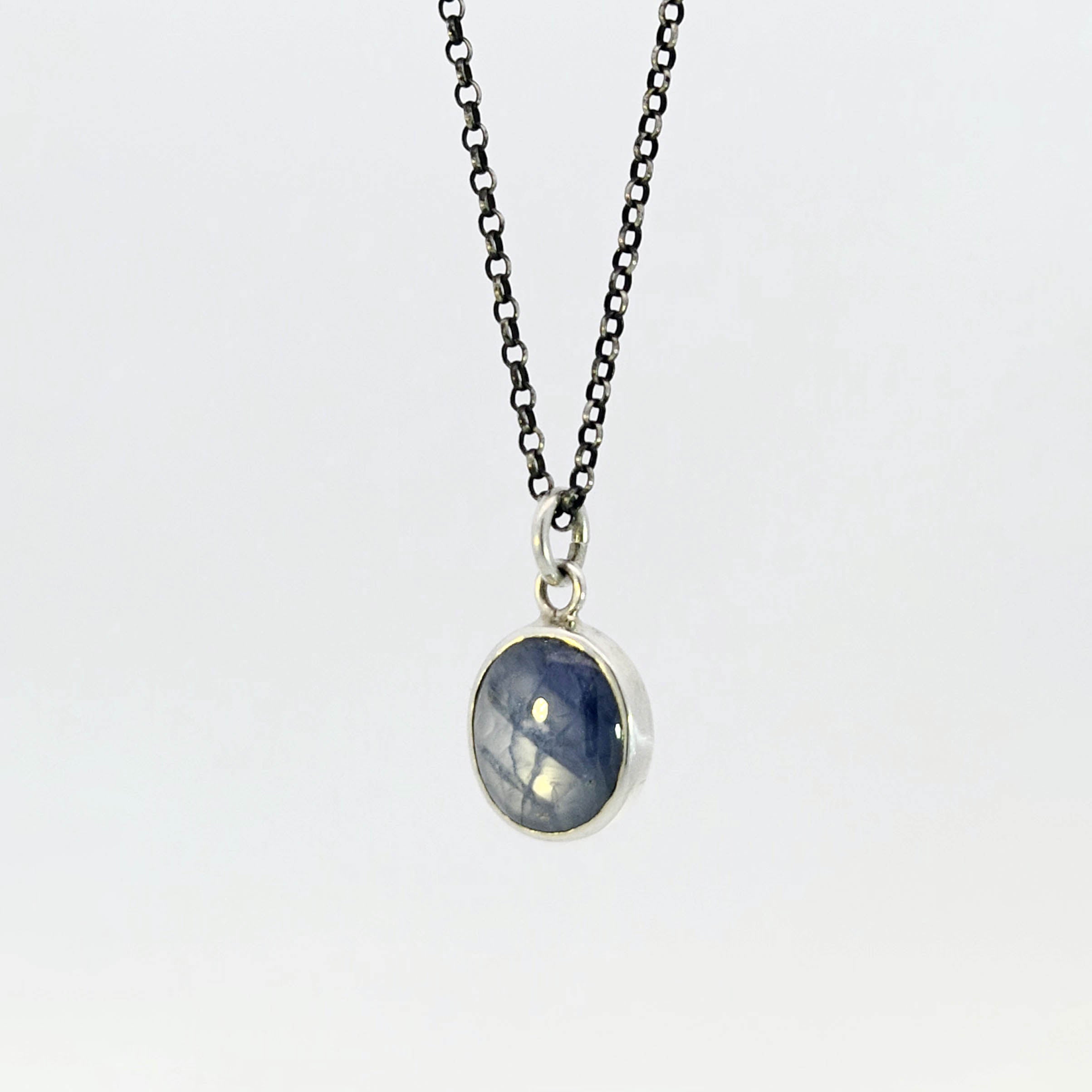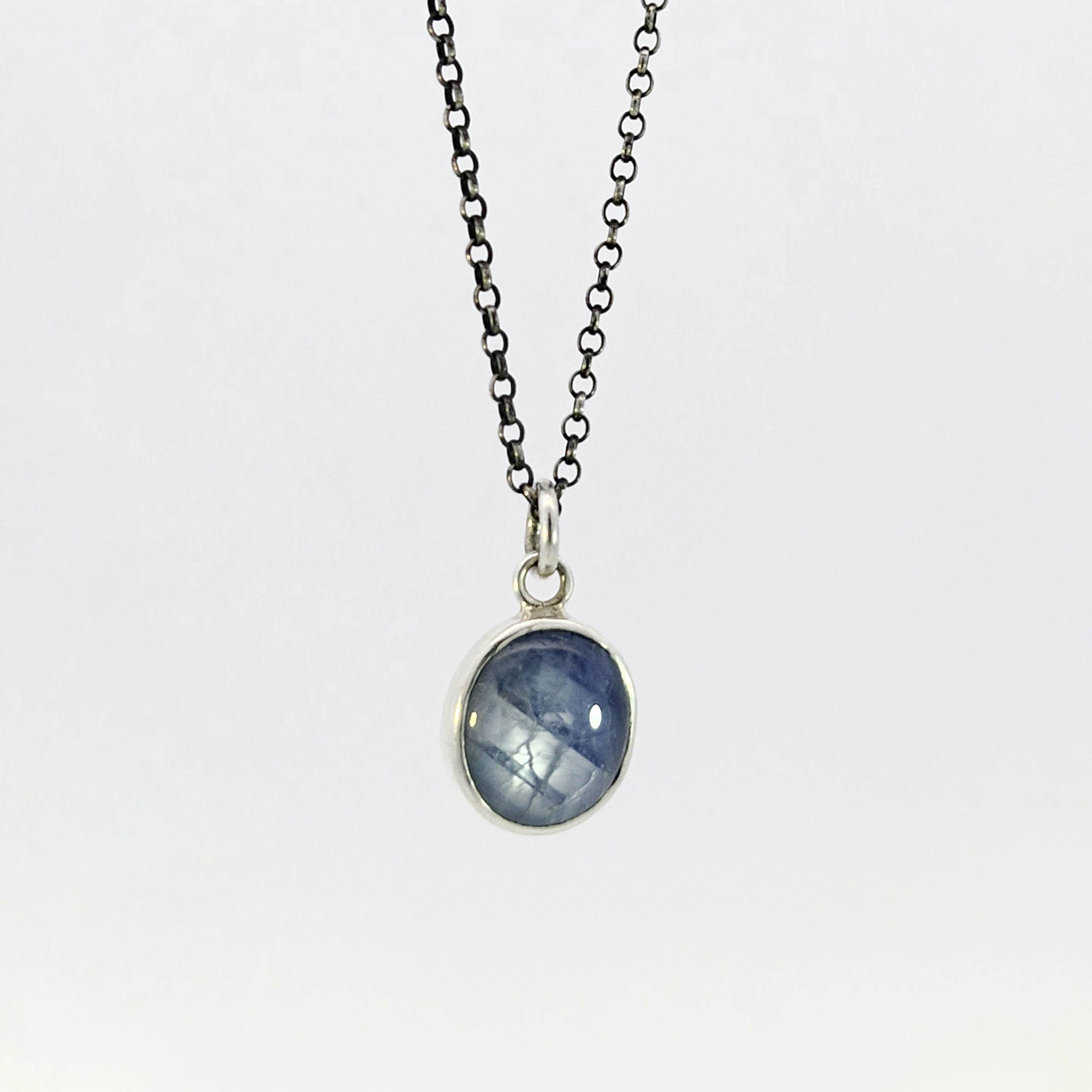 A pale blue sapphire I picked up in Malaysia, bezel set in a clean, hand-fabricated sterling mount. One of a kind, made by hand at my bench. Includes an adjustable 20" antiqued sterling silver rollo chain, wearable at 16", 18", or 20".