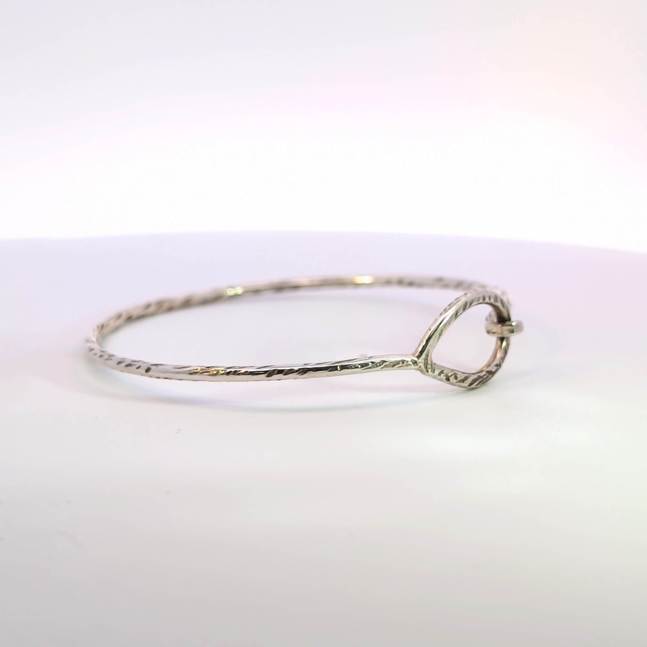 Lightly textured organic bracelet with subtle hammer marks and large tension clasp detail. Can be worn with on its own or as a charm bracelet with Plum and Posey charms. One of a kind, directly from my bench. Includes a branded gift bag and care card.