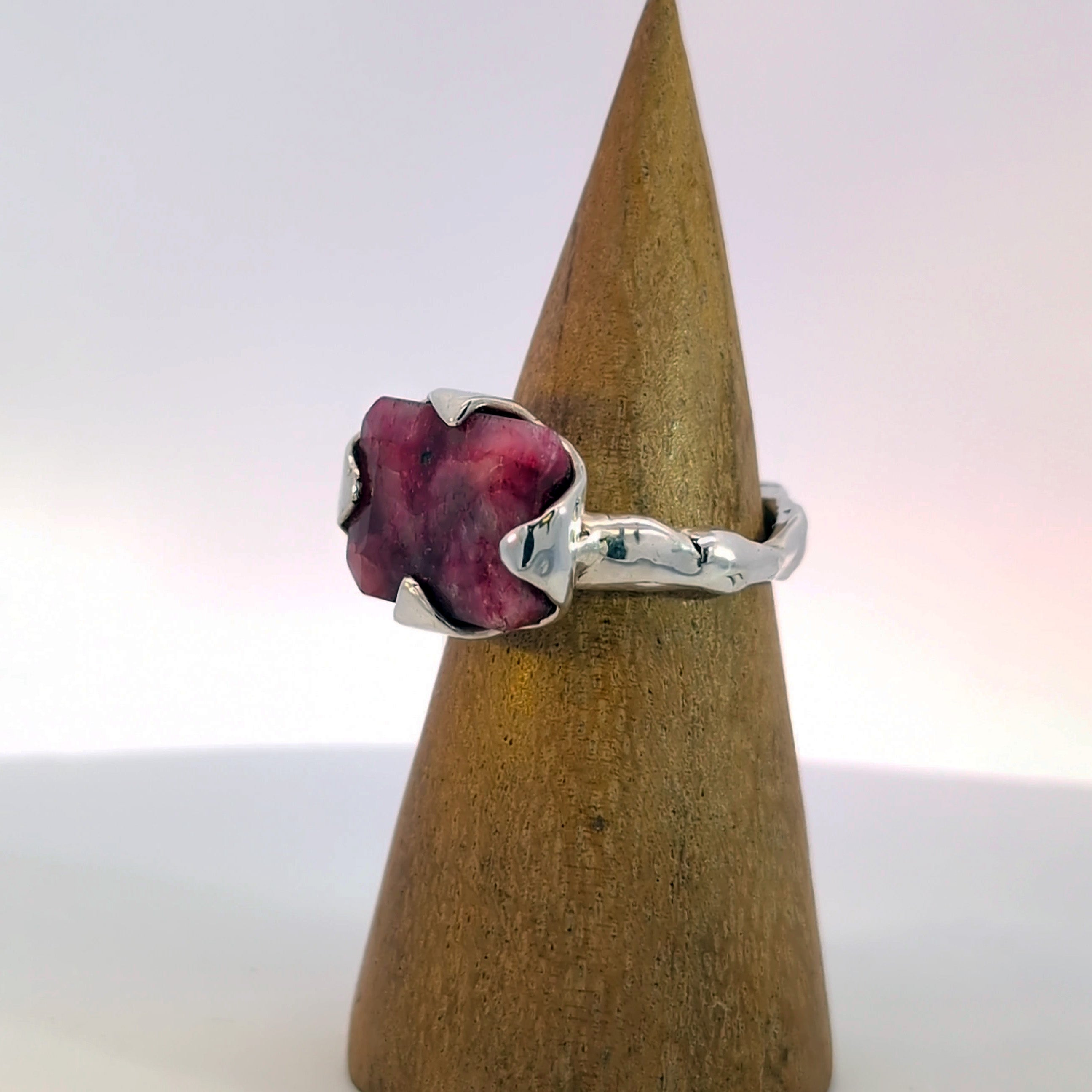 Large oblong ruby in a hand-formed hybrid bezel and prong setting, off-center and boldly organic. Includes a branded gift bag and care card.