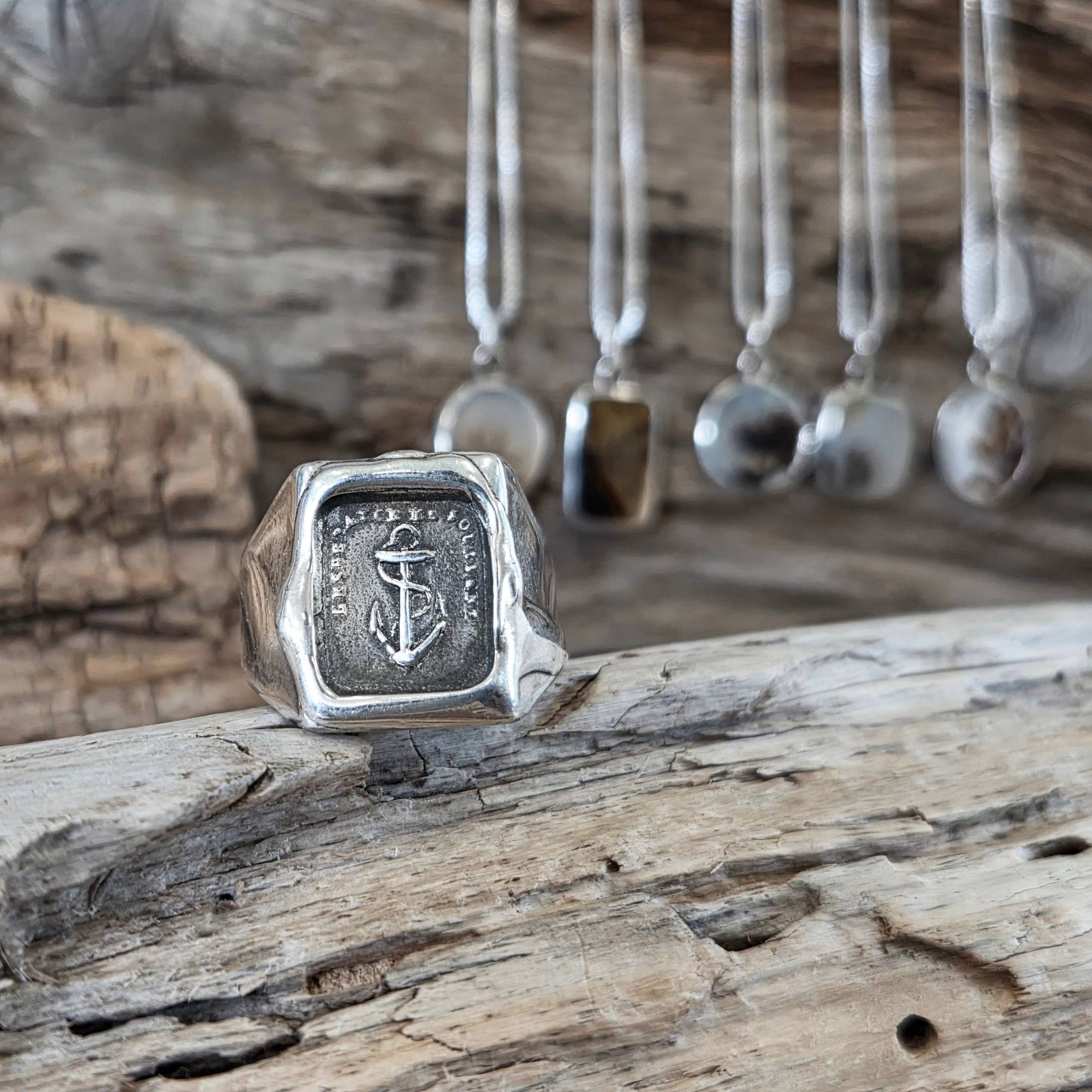 An organic, fluid handmade sterling signet ring featuring the anchor, a long-standing symbol of hope and steadiness, created using the impression of an antique wax seal. Includes a branded gift bag, care card, and meaning card.