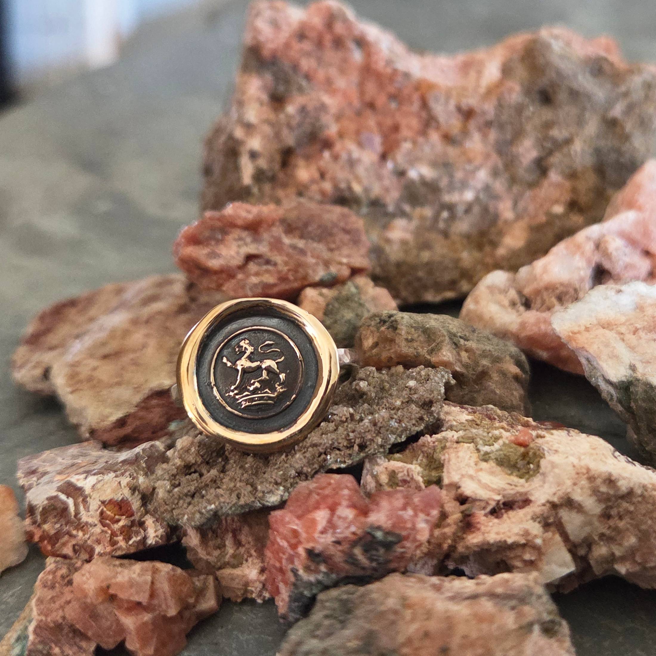 Lion Passant on Crown Seal Ring, Bronze on Sterling, Size 8