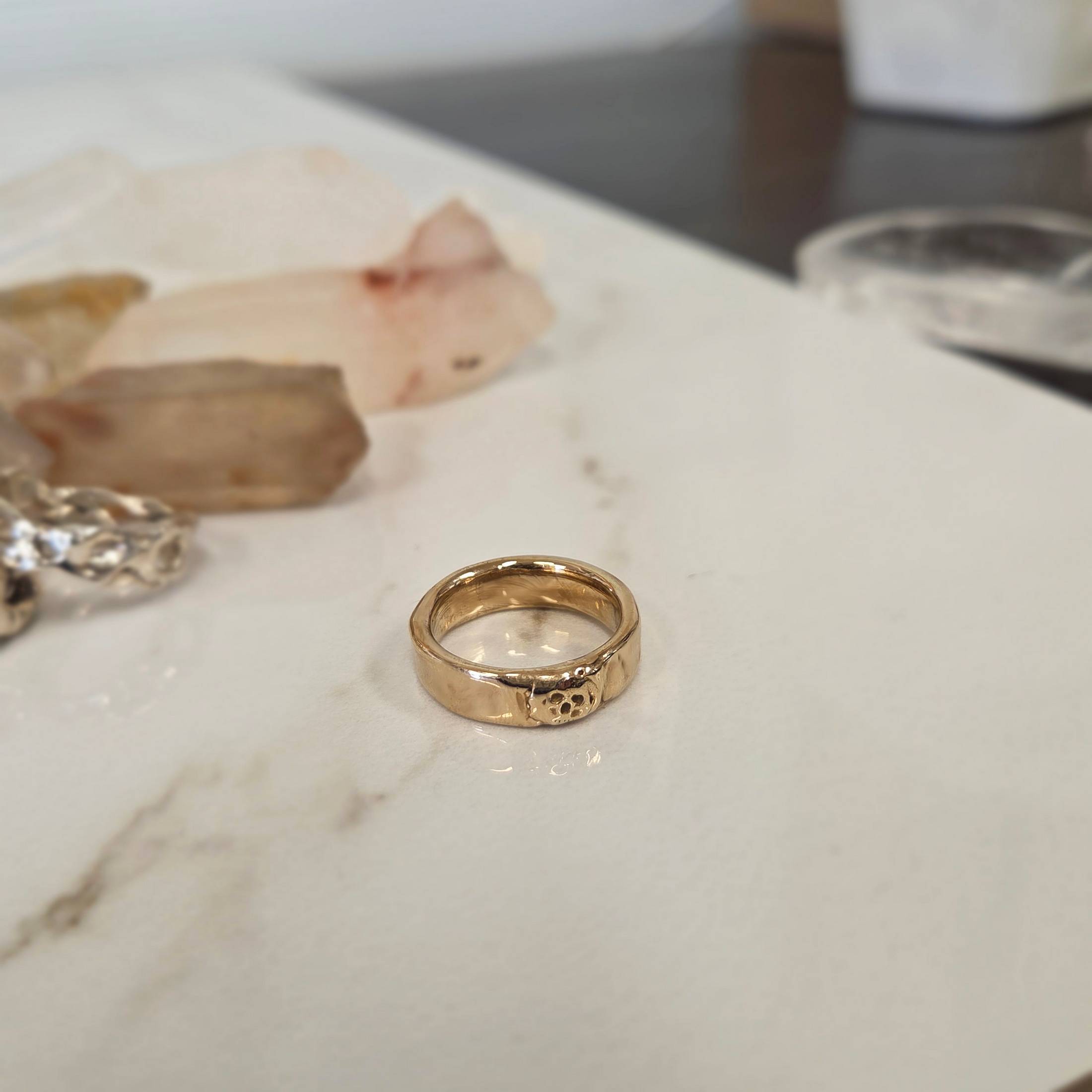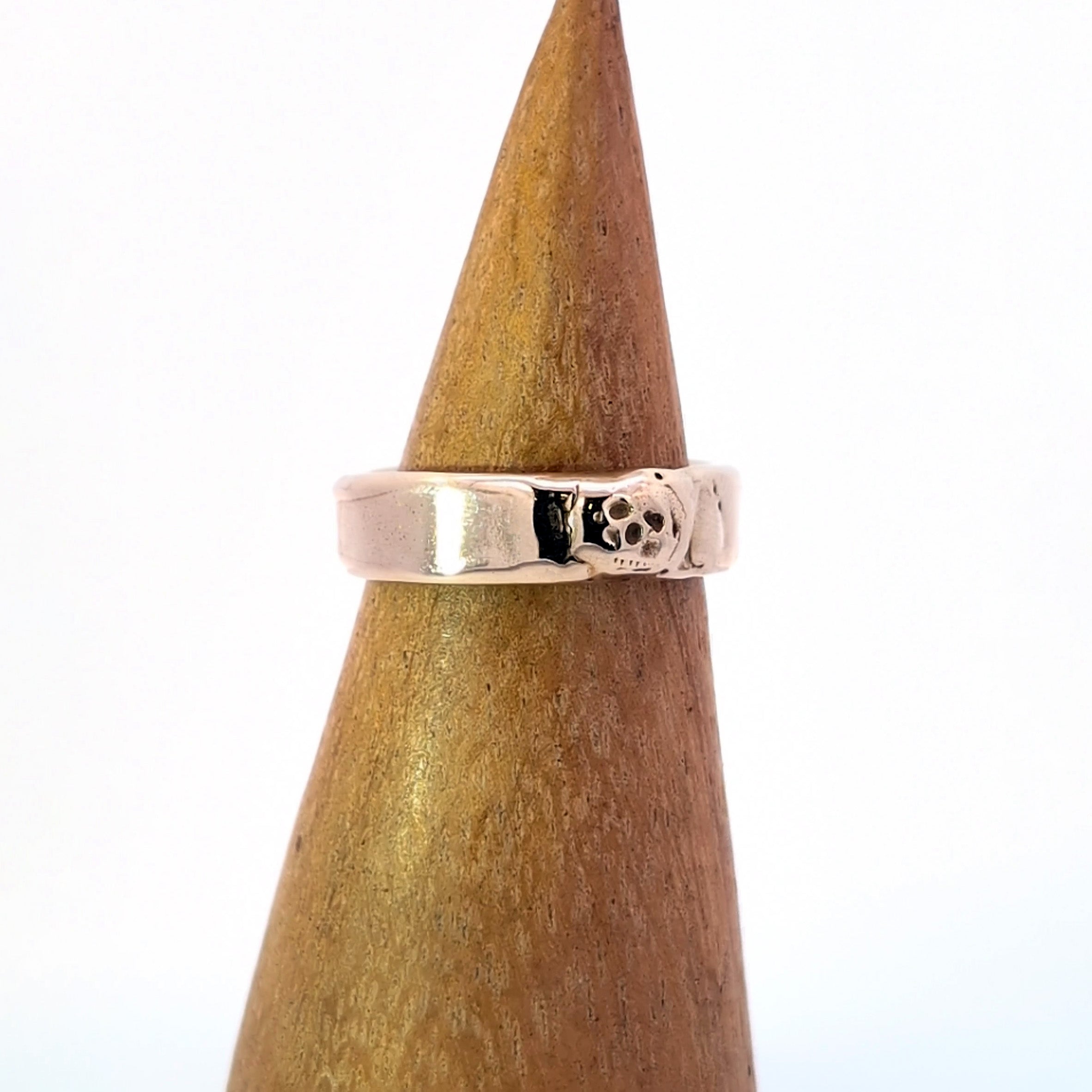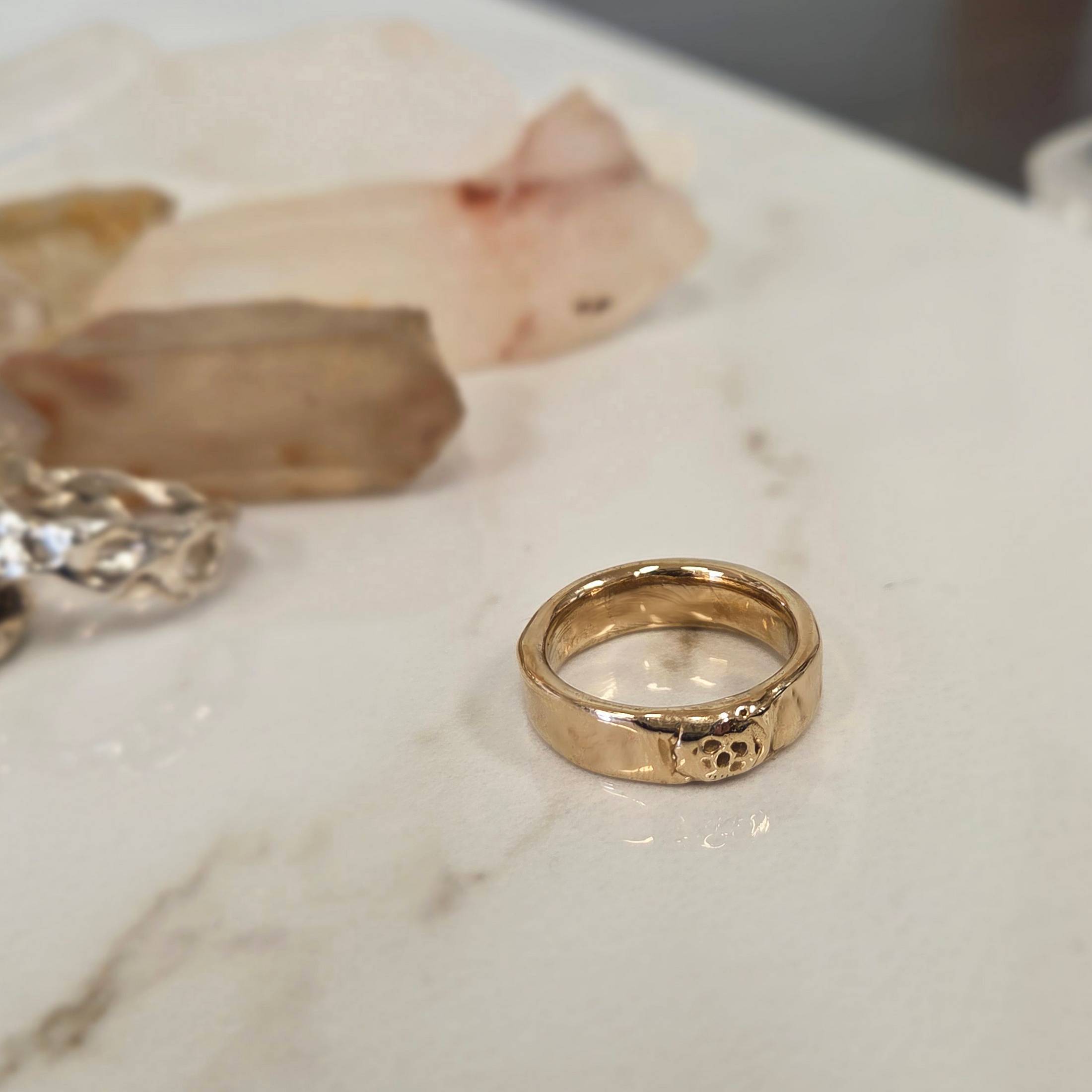A handmade bronze ring featuring a petite skull emerging from the metal band. Includes a branded gift bag and care card. Some of the images show the skull upside down