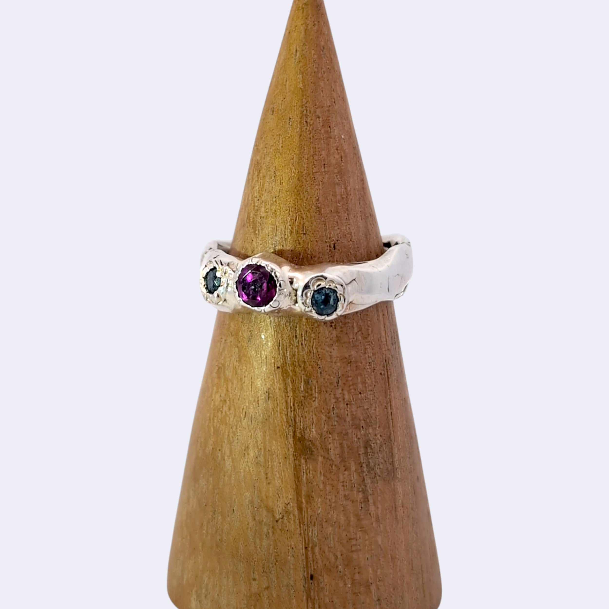 Hand-formed textured sterling band with a bright rhodolite garnet in a flush and bezel blend setting, flanked by two blue topaz accents in matching settings. Includes a branded gift bag and care card.