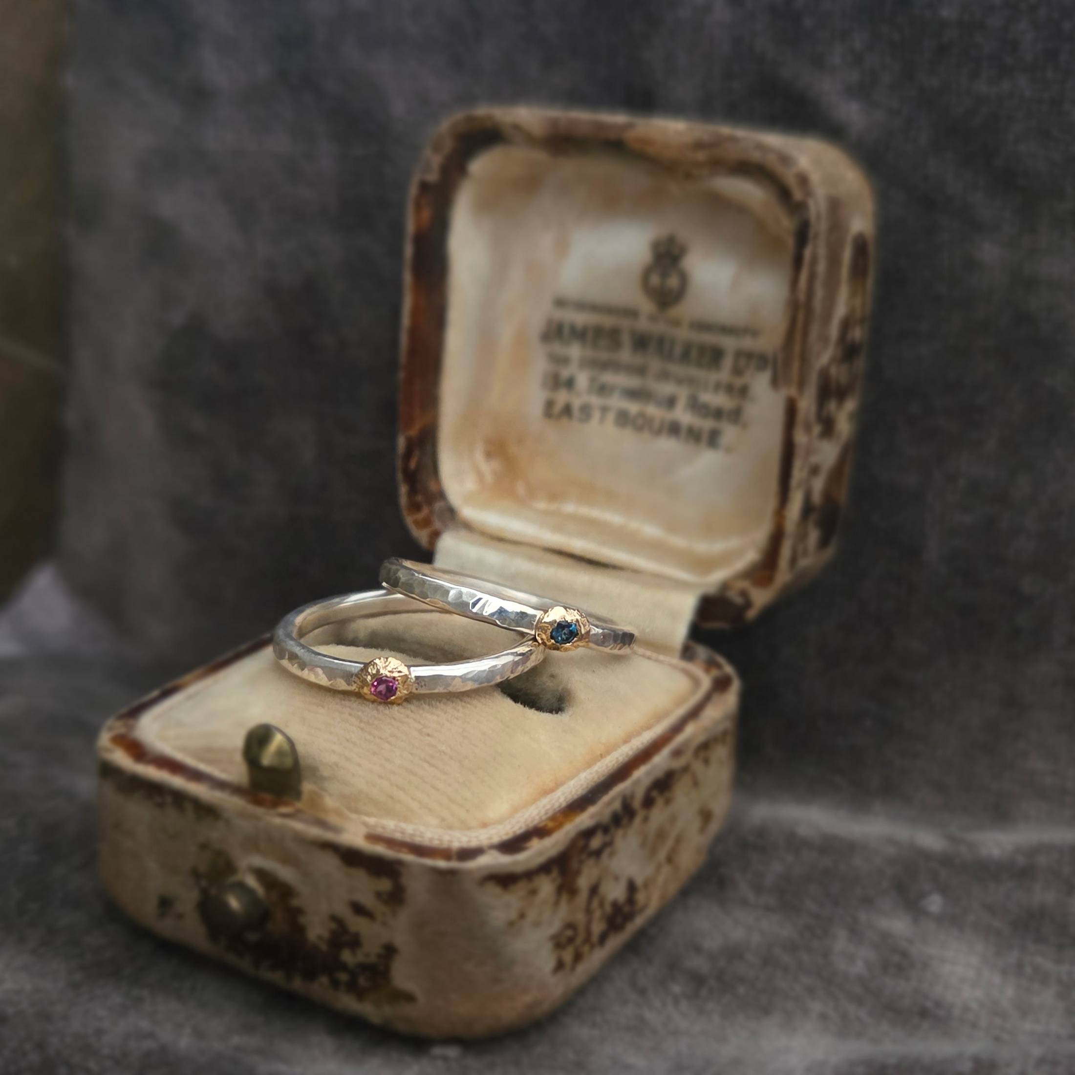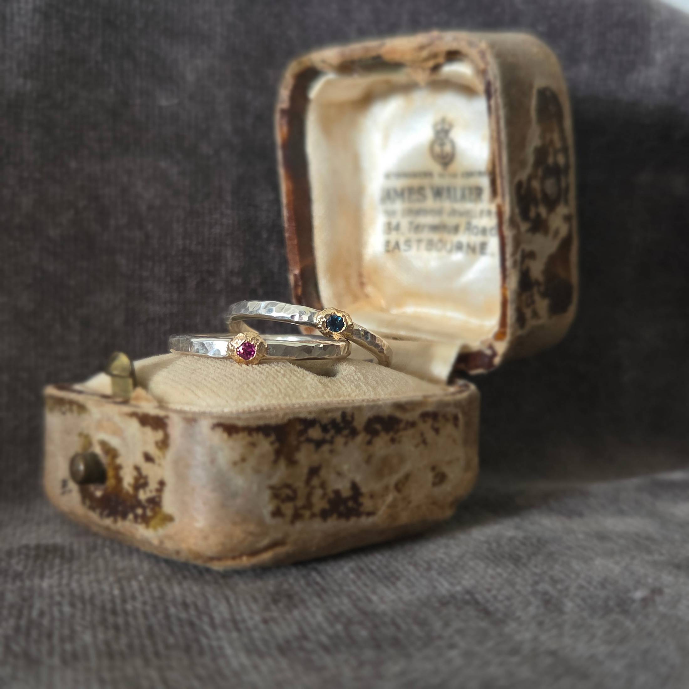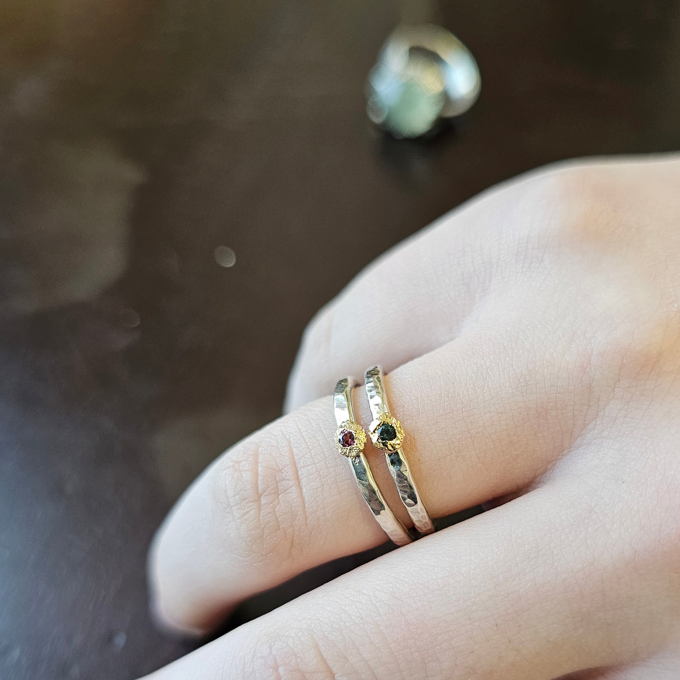 A pair of hand-fabricated stacking rings, one deep green tourmaline and one light pink, each with a textured bezel look. Wear together or alone. Includes a branded gift bag and care card. Please note the antique jewelry box is not included with the rings.One of a kind: this piece is unique. When it's gone, it's gone. This ring can't be resized.DetailsMaterial: Sterling silver