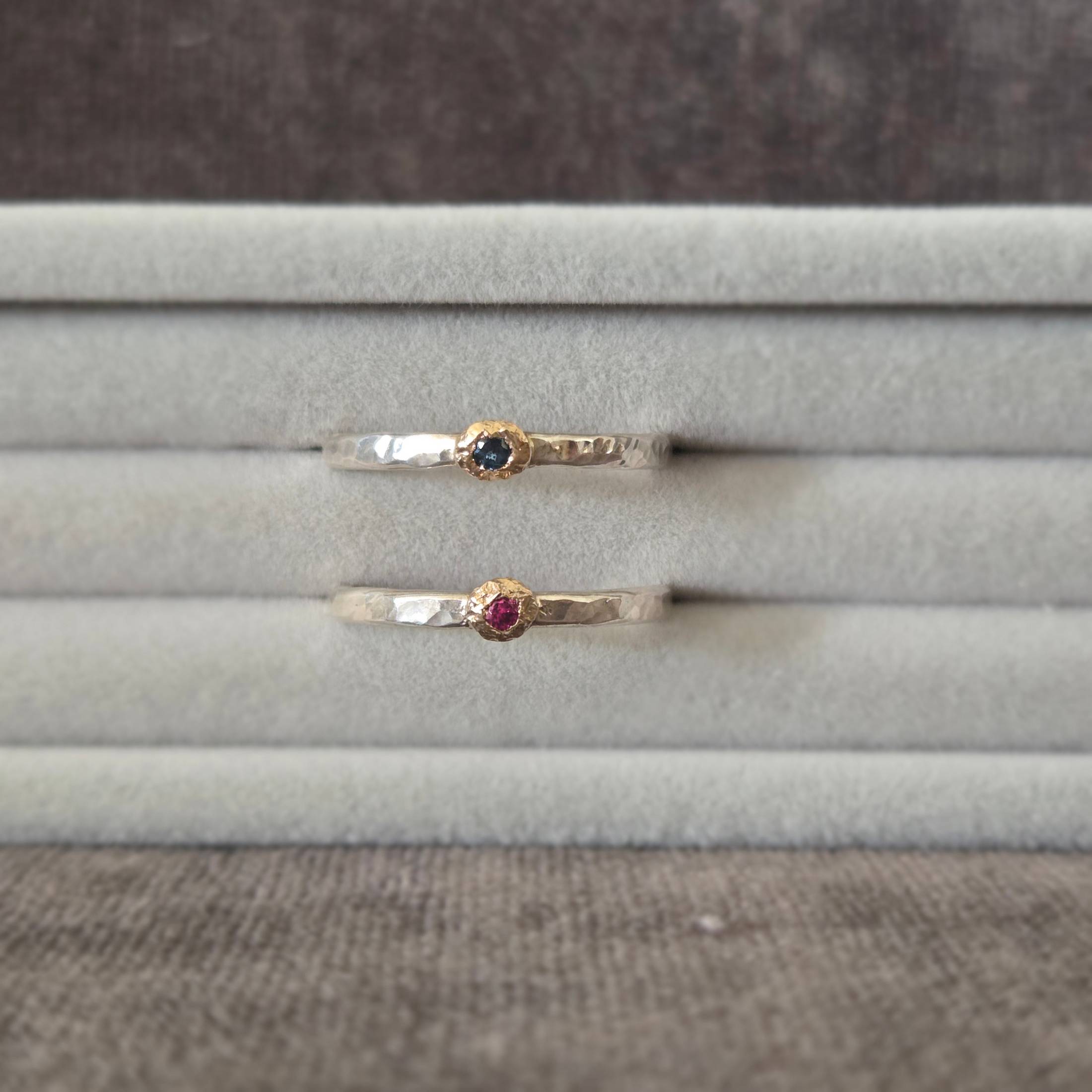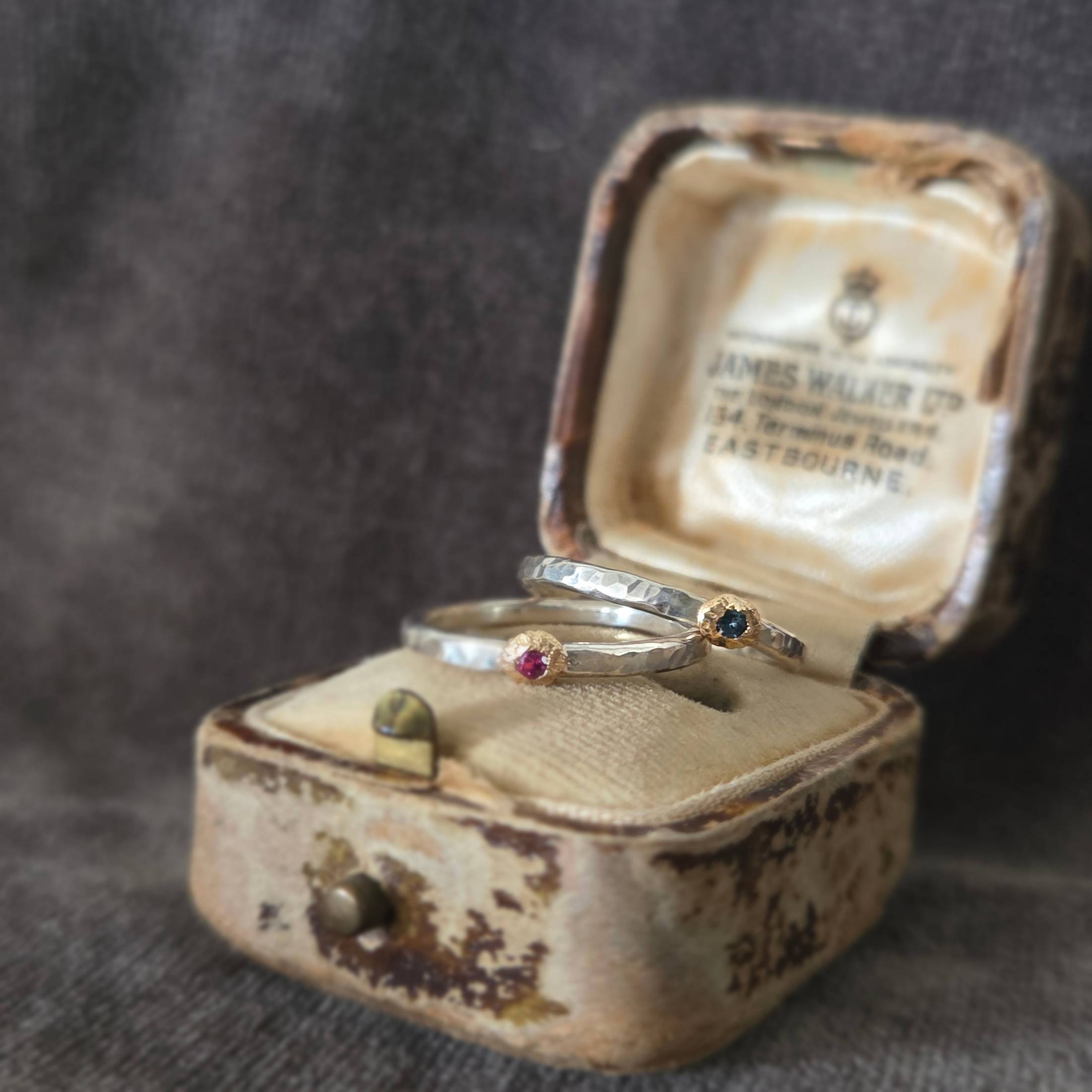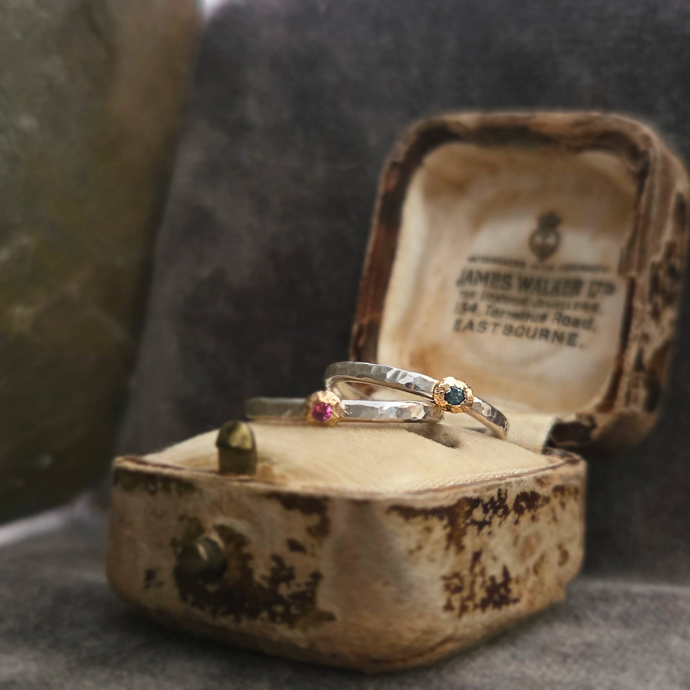 A pair of hand-fabricated stacking rings, one deep green tourmaline and one light pink, each with a textured bezel look. Wear together or alone. Includes a branded gift bag and care card. Please note the antique jewelry box is not included with the rings.One of a kind: this piece is unique. When it's gone, it's gone. This ring can't be resized.DetailsMaterial: Sterling silver