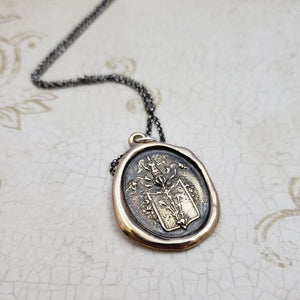 Handcrafted using the impression of an 18th century French wax seal, this pendant features an angel atop a crest of three Fleur de Lis. Angels in heraldry represent glory & honour, they are the bearers of joyful news. The Fleur de Lis symbolizes purity & light. When three of the flowers are shown, it is also emblematic of beauty.