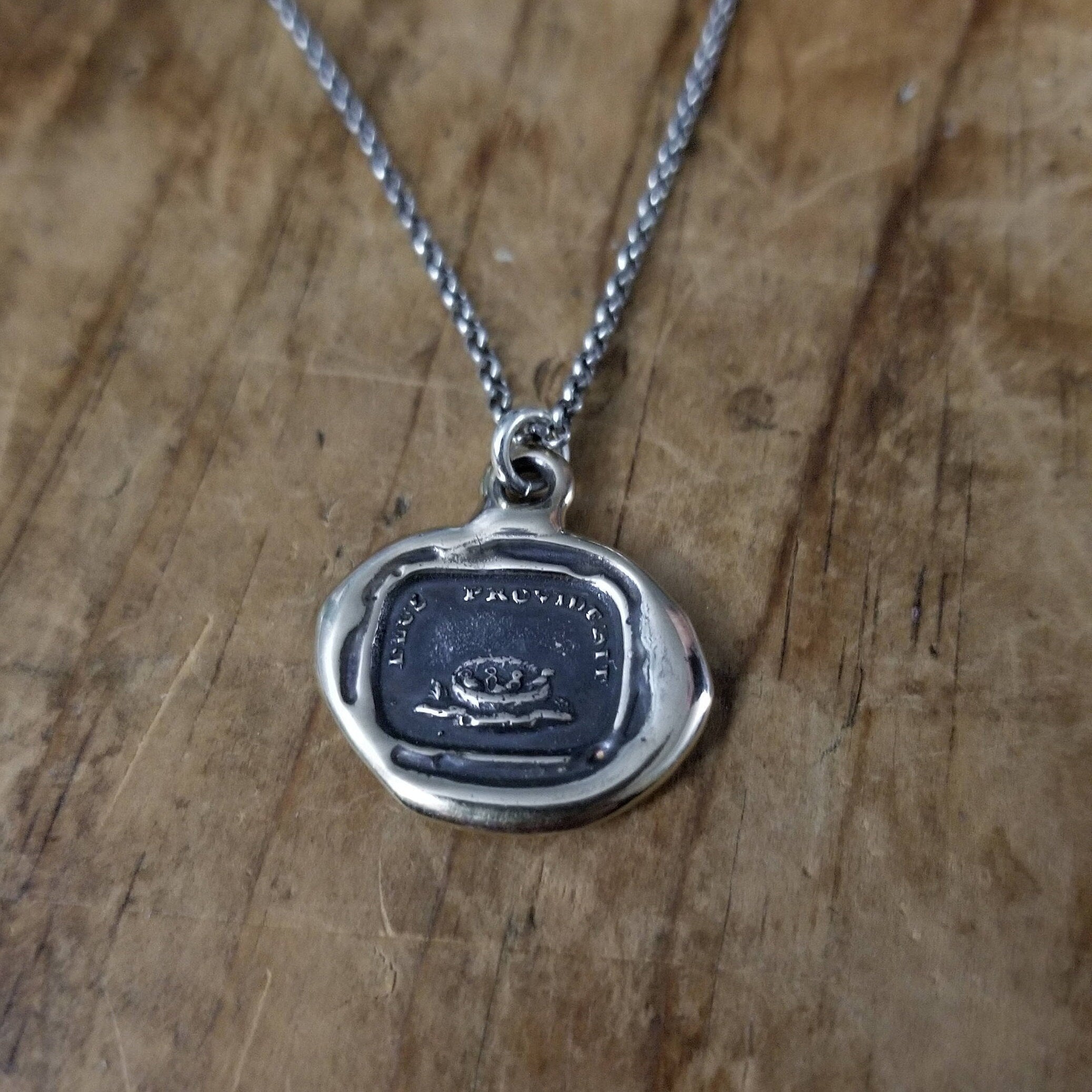 Handcrafted using the impression of an early 19th Century British wax seal, this pendant features a nest of baby ravens with the Latin text around it reading ‘Deus Providebit’.